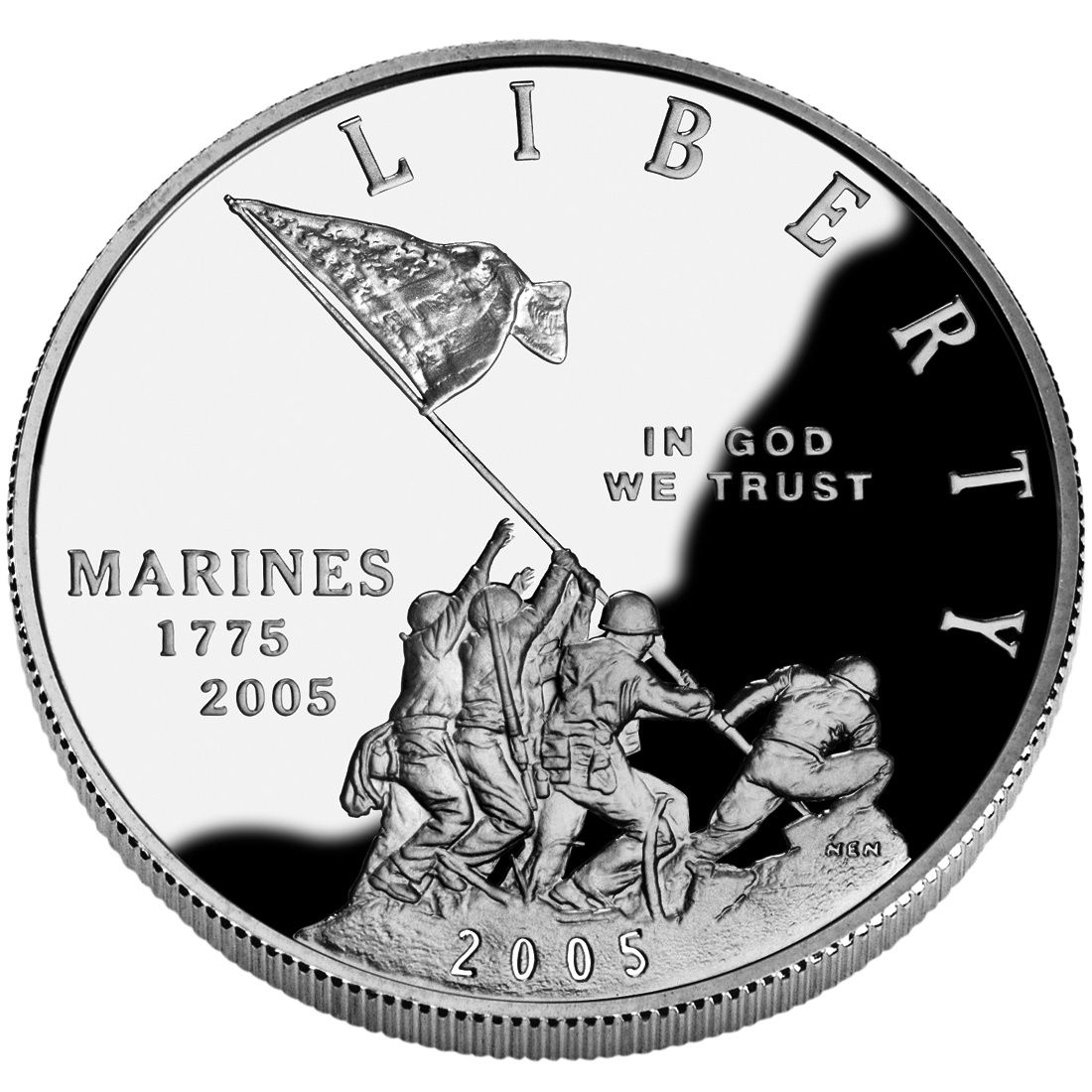 The obverse of 2005 Marine Corps Silver Dollar features the famous scene of Marines raising an American Flag over Iwo Jima that was photographed by Joe Rosenthal. The inscriptions include “Liberty”, “In God We Trust”, “Marines”, and the anniversary dates “1775” and “2005”. 2005 and the artist’s initials are both placed within the rock outcropping that is the summit of Mount Suribachi. The obverse was modeled by Norman E. Nemeth based on the photograph.