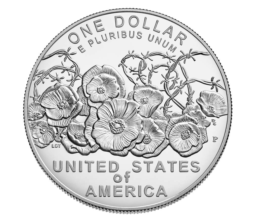 Reverse: The reverse (tails) design, titled “Poppies in the Wire,” features abstract poppies mixed in with barbed wire. Inscriptions include “ONE DOLLAR,” “E PLURIBUS UNUM,” and “UNITED STATES OF AMERICA.”
