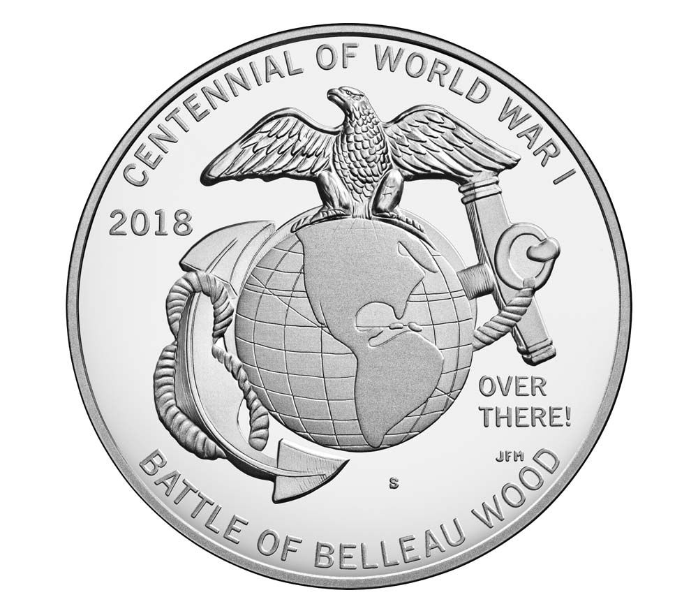 Reverse: The reverse design depicts the World War I-era version of the Eagle, Globe, and Anchor emblem. Inscriptions include “CENTENNIAL OF WORLD WAR I,” “2018,” “OVER THERE!,” and “BATTLE OF BELLEAU WOOD.”