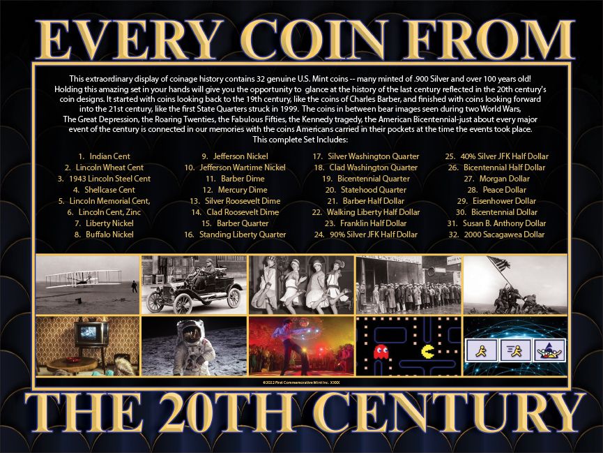 Own every coin design issued for circulation (gold coins are not included) in the past 100 years! This extraordinary display of coinage history contains 32 genuine U.S. Mint coins -- many minted of .900 Silver and over 100 years old!