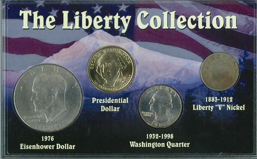 This collection contains four classic U.S. Coins featuring four different images celebrating liberty. The Presidential Dollar, first minted in 2007, features the Statue of Liberty on the reverse of the coin. The Eisenhower Dollar, the largest modern dollar coin depicts the Liberty Bell. The Washington Quarter shows an American Eagle, and the Liberty 'V' Nickel has a portrait of Lady Liberty.